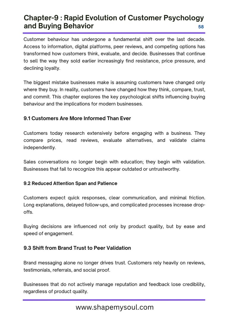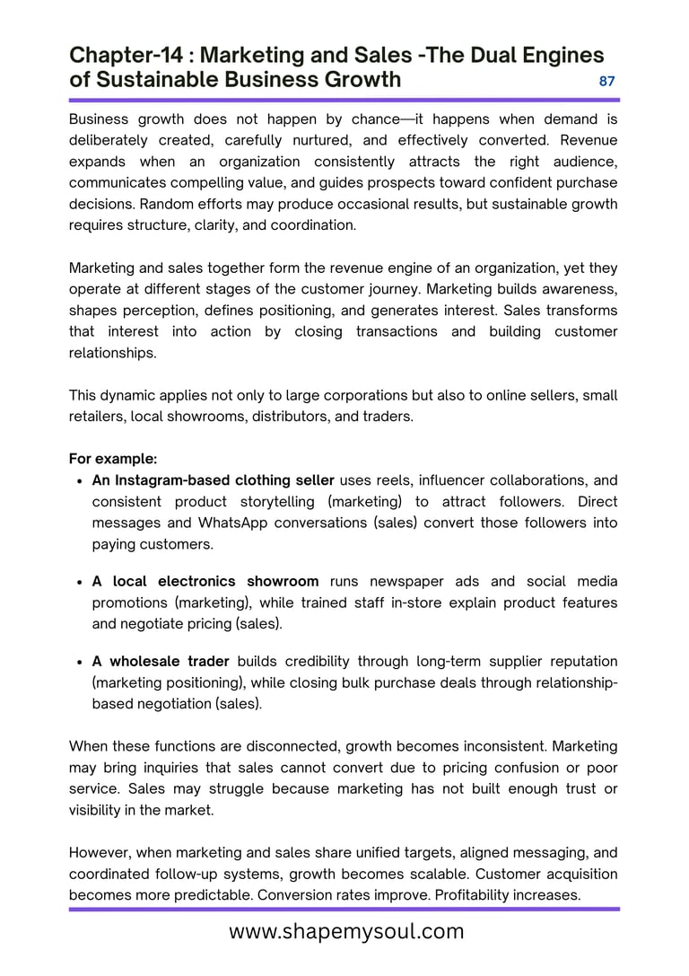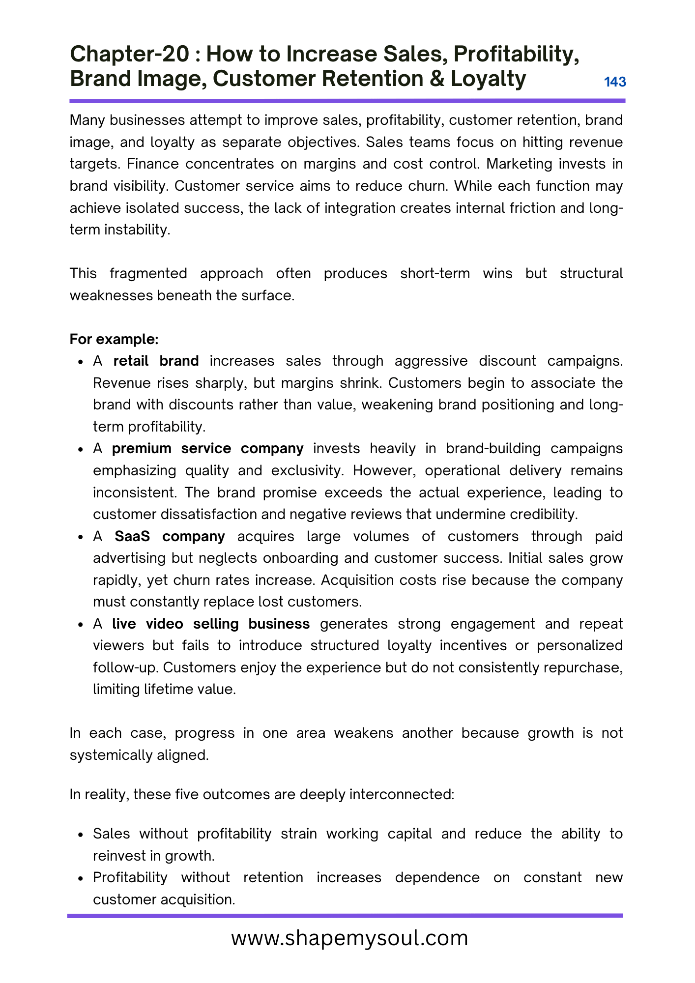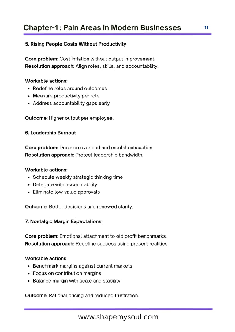 The book contains 20 structured chapters across 172 pages, each addressing real-world business challenges such as rising costs, inconsistent sales, increasing competition, and changing customer behavior. Every chapter follows a practical consulting format, focusing on key business problems, clear resolutions, workable actions, and the expected outcomes and impact on business performance.